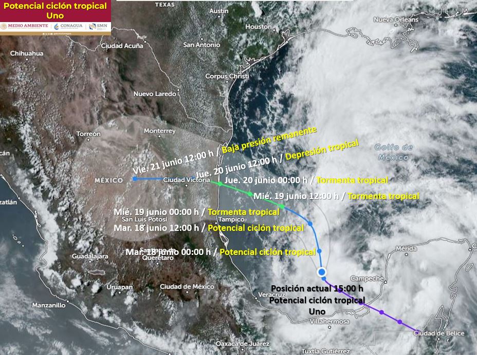 멕시코 국립기상청(SMN)은 6.17.(월) 15:00 기준, 멕시코만에 열대성 폭풍(UNO)이 생성된 것이 관측되었으며, 캄페체, 타바스코, 치아파스, 유카탄, 킨타나로주 등 남부지역이 직접영향권에 들 것으로 전망하는 한편, 오아하카, 베라크루스, 푸에블라등 중부지방에도 많은 비가 내릴 것으로 예상했습니다.